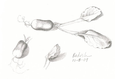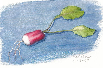We went out to eat and I had this pretty radish as a garnish beside my fritter. I smuggled the radish home in my purse so I could sketch it the next day. I sketched it in graphite first then water color and colored pencil to see which one I liked best. The water color definitely won–more fun and prettier too in my opinion.