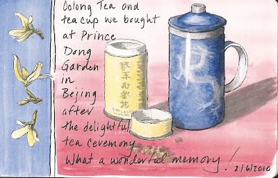 I am fond of this teacup because it reminds me of our trip to China in 2004. I bought the cup and the Oolong tea on our first day there. The teacup has a removable infuser that fits inside so it really is a cup and a teapot in one.