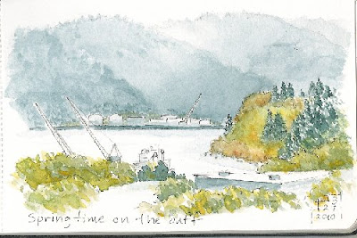 I walk along the bluff overlooking the Willamette River several times a week, and this is one of my favorite views. I particularly enjoy it in late afternoon when the sunlight skims over the top of the distant hills and lights up the promontory. Right now the new grass makes the hillside a glowing lime green. Across the river is an industrial area, and on this side ships dock on Swan Island, although it is not really an island. I stopped to do this sketch in my little 3″ x 5″ moleskine on one of my recent walks.  I did the original sketch in graphite, then added watercolors at home.
