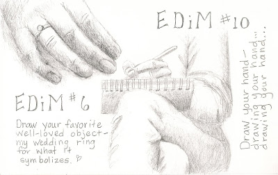 5. Yay for pencil sketch! =) I think you did an amazing job with the hand, and hit the marks on those EDM challenges