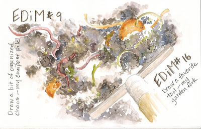 This was one of the most fun EDiM challenges yet.  I have been wanting to sketch some worms for awhile now and here was my opportunity.  I must confess that I am rather fond of my worms (there I said it).  They do such an amazing job, along with the bacteria, fungi, protozoa and nematodes in my compost bin, of breaking down our kitchen scraps into wonderful rich brown compost.  This hard working crew gets the job done, from fresh scraps to compost, in only about 2 weeks during spring, summer and autumn!