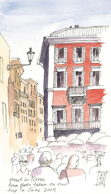 I am very excited about the Urban Sketchers Symposium that starts tomorrow here in Portland. In an effort to get “warmed up” I did this sketch of a street scene in Rome from a photo I took last summer. I am hoping to improve my line quality and get looser with my sketches through what I learn from the symposium. I’ll keep you posted!
