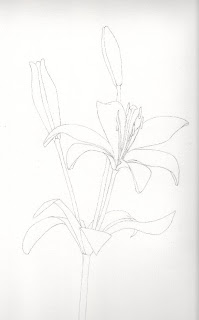 I just finished my first assignment which had three parts.  Part One was to produce a line drawing in pencil or ink.  I decided I would play it safe and do it in pencil.  The pencil lines were to be lightly drawn, as if for a preliminary drawing for a water color.  We were supposed to chose a subject with a simple clean line, and include the supporting stem of the flower or leaf. I bought an Asiatic lily from the supermarket, and proceeded to carefully recreate it on paper.  I didn’t realize that one of its petals was missing until another bud opened up and–yikes!  All of our drawings are supposed to be botanically correct, so this would have had a major affect on my evaluation.  Fortunately, I had been accurate enough in my drawing, that I was able to simply fill in another petal where it should have been!  Whew!