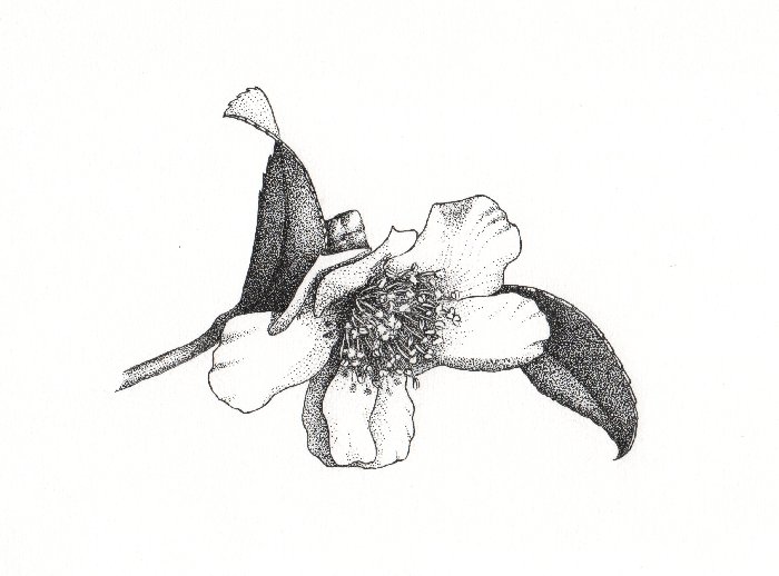 2. Stippled ink Yuletide Camellia–She said the presentation was neat, the flower showed effort, and my stipples generally showed the contour of the petals.  The complex center showed the fluffy texture but had become overworked.  My leaves were too dark and didn’t show venation.  Again, I did not close the end of the stem correctly.  She advised that I do a small camellia leaf study in stippling my sketchbook.  I did some stippling exercises later, but chose Sarcococca leaves and a Flowering Quince twig instead of a Camellia leaf, which has almost no visible venation. Sarcococca leaves have the same thickness and texture of Camellia leaves but the venation is more prominent.