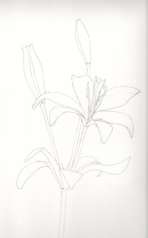I just finished my first assignment which had three parts. Part One was to produce a line drawing in pencil or ink. I decided I would play it safe and do it in pencil. The pencil lines were to be lightly drawn, as if for a preliminary drawing for a water color. We were supposed to chose a subject with a simple clean line, and include the supporting stem of the flower or leaf. I bought an Asiatic lily from the supermarket, and proceeded to carefully recreate it on paper. I didn’t realize that one of its petals was missing until another bud opened up and–yikes! All of our drawings are supposed to be botanically correct, so this would have had a major affect on my evaluation. Fortunately, I had been accurate enough in my drawing, that I was able to simply fill in another petal where it should have been! Whew!