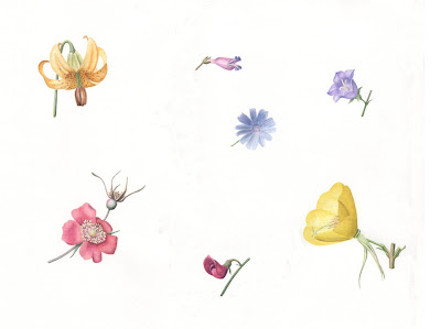 This is my fourth assignment in the Society of Botanical Art course that I am taking. We were supposed to depict blossoms of different shapes, colors and sizes (all life-size). The perspective should accurately describe the construction of the blossom, ie having a throat or a cup-shape. I chose to feature plants that are native or naturalized in the area where I live. It was a very challenging assignment but I learned a lot!