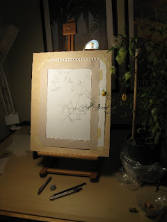 Golden Clematis is one of my favorite vines so I was pleased to see that it had so many blossoms during September and October while I was working on this assignment, the fifth in the SBA course I am taking. I spent more time on composition and a tonal study than I did on the actual painting, and I am glad that I did because it is such a complex subject (at least for me as a beginner at botanical painting). The odd angles and twisting stems made it difficult to establish where everything was in relation to everything else.