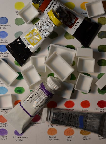 I’m one who uses tube pans on both my big and small palettes. I will put tube paint into the half pans for my smaller/portable sets but squeeze them onto my larger studio palettes. Winsor Newton and Sennelier rewet just fine with no noticeable loss in potency. I always put a couple drops of water on the dried color to reactivate it and don’t have a problem. Cheaper watercolors there can be problems with rewetting.