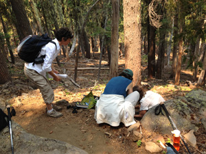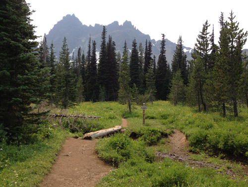 The next day we took the Canyon Creek Meadow Hike, which wends its way through another Ponderosa pine forest, under the shadow of one of the dormant volcanoes that make up the Cascade Mountain Range. The trail followed a stream for awhile, passed several small lakes, then brought us to meadows with a view of of the craggy mountain called Three Fingered Jack.