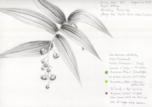 I recently spent a weekend hiking and sketching in eastern Oregon with a group from Oregon Botanical Artists. The weekend was generously hosted by two eastern Oregon botanical artists so we could get to know one another better. We spent the first day sketching at an area called the Metolius Preserve, where an effort is being made to preserve and restore an old growth Ponderosa pine forest. Since the day was rather hot, I found a shady spot near a stream where the plants grew green and thick to draw the berries and leaves of a Star-flowered False Solomon’s Seal, Smilacina stellata.