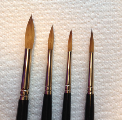 Here’s the lineup of brushes from left to right: #8 W&N; #6 DaVinci; #4 W&N; #4 Raphael extra pointed–just look at that point! Btw, even though all of these brushes are fairly well used, I think the points are still representative.